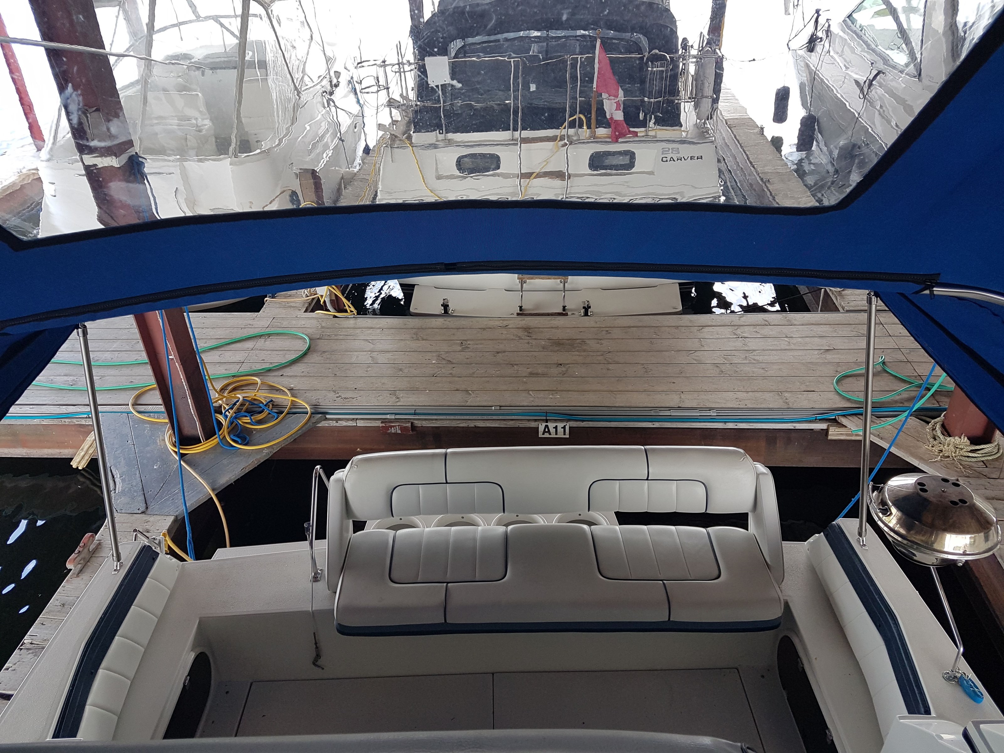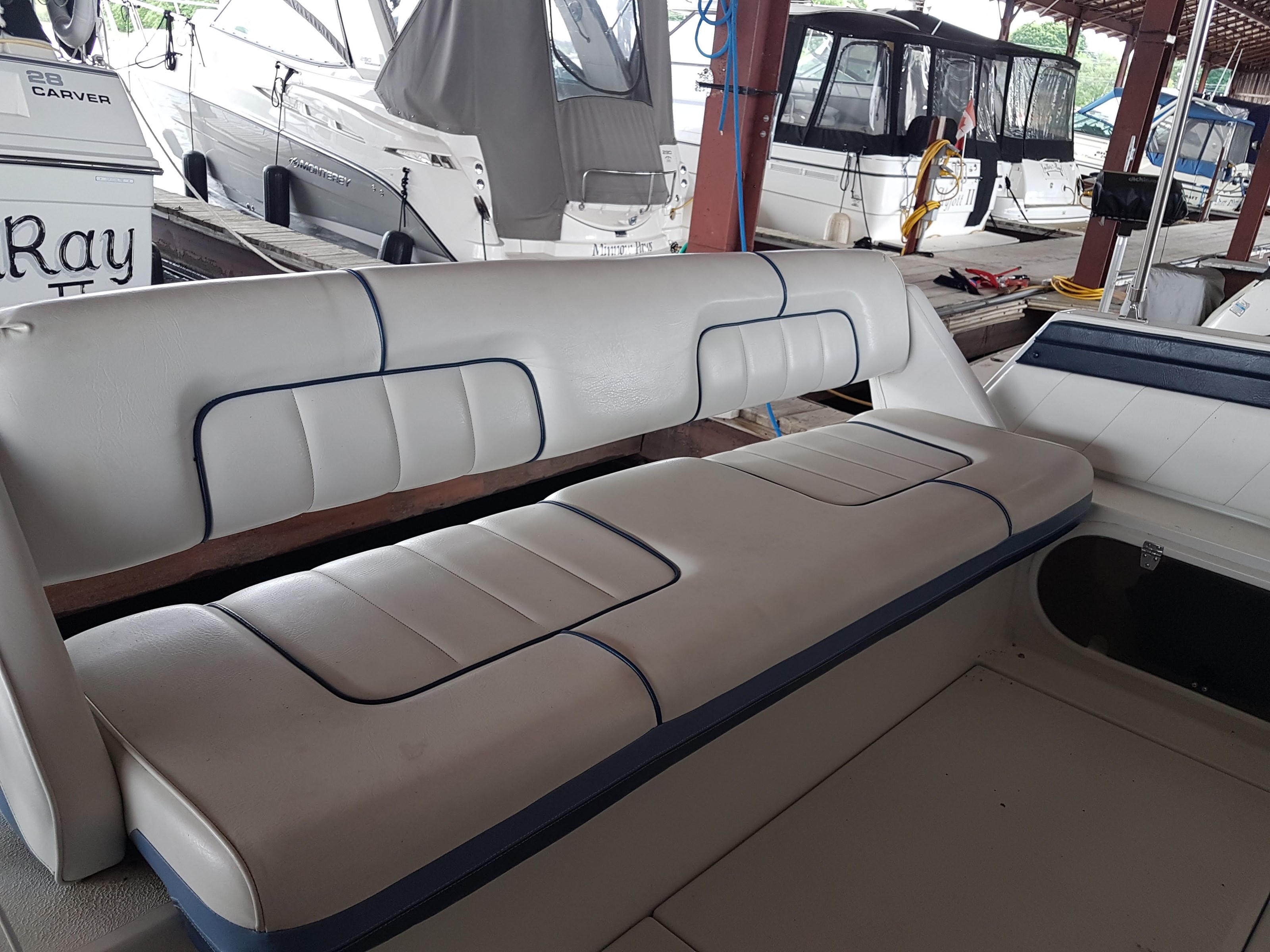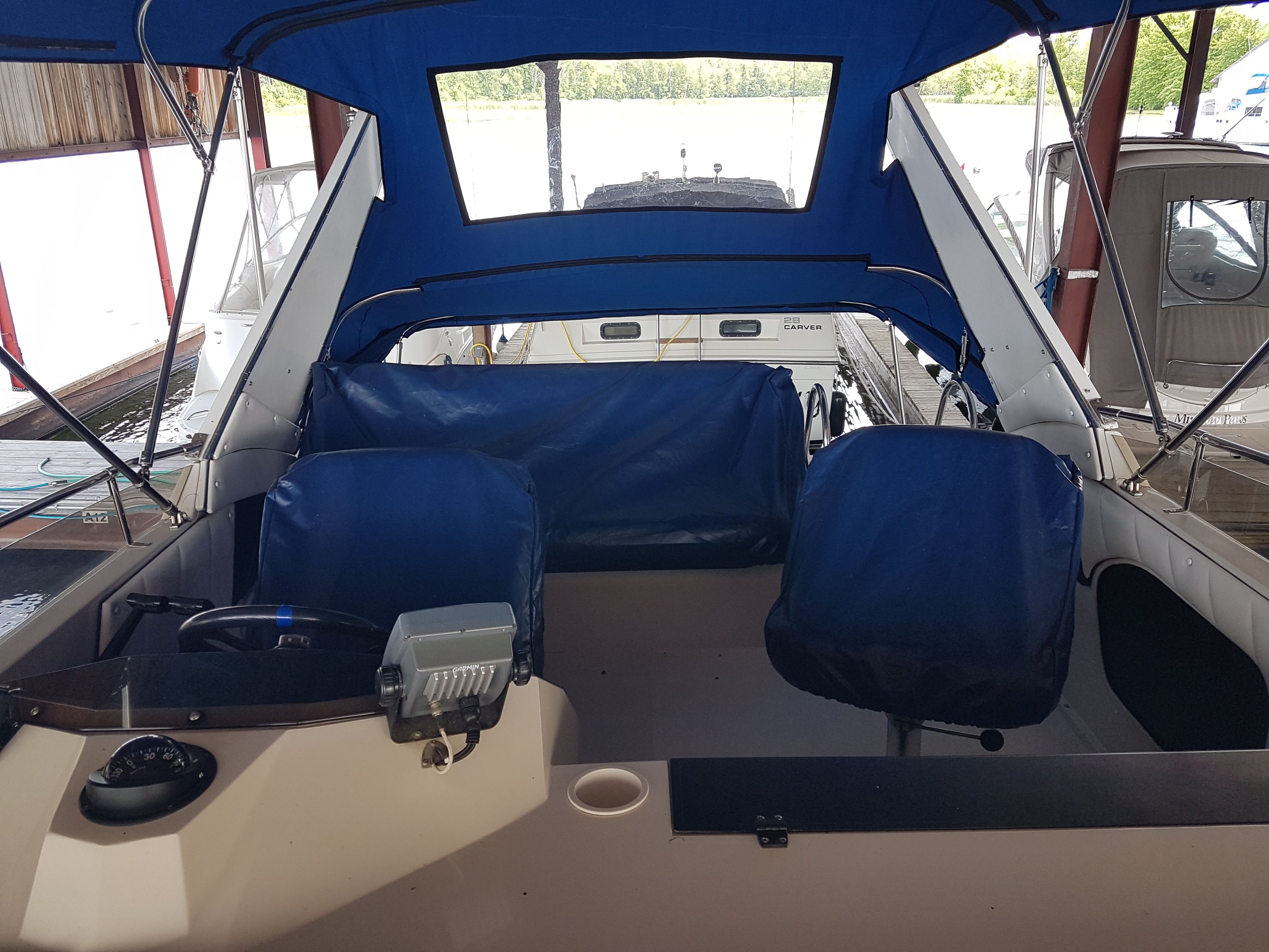 All new interior seating, a new mattress, interior curtains, and a sun pad were installed in 2020. Covers were made for the exterior chairs and benches in 2021. A new bimini top and modern exterior shade curtains were made at the end of the 2022 boating season. All fabrics are Sunbrella. The bimini top and shade curtains were installed in June 2023 and the boat has remained docked in a covered shed since that time.