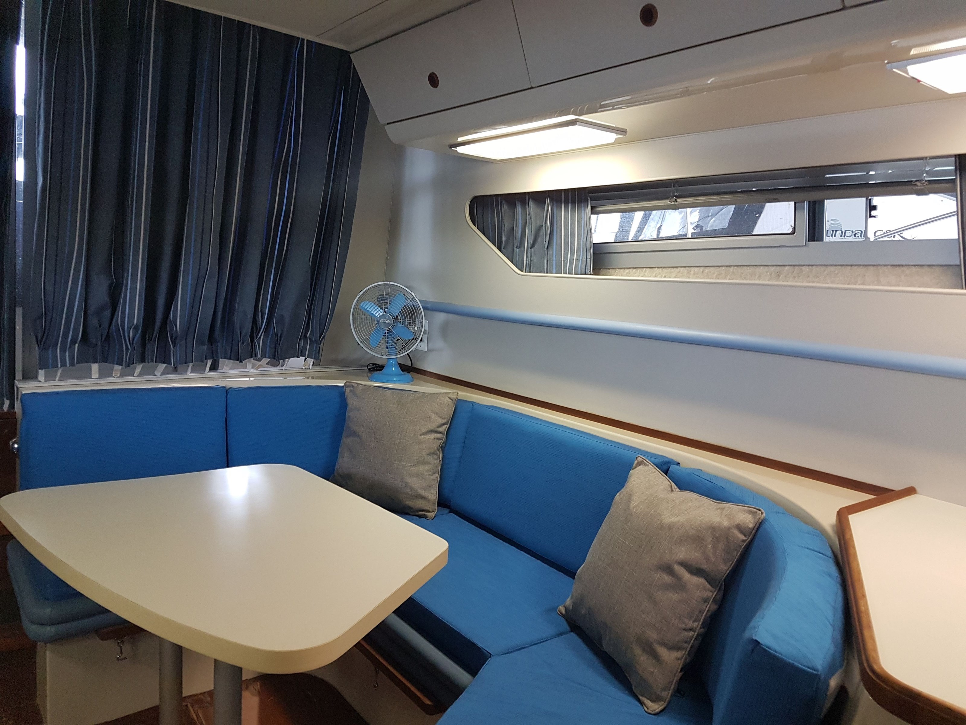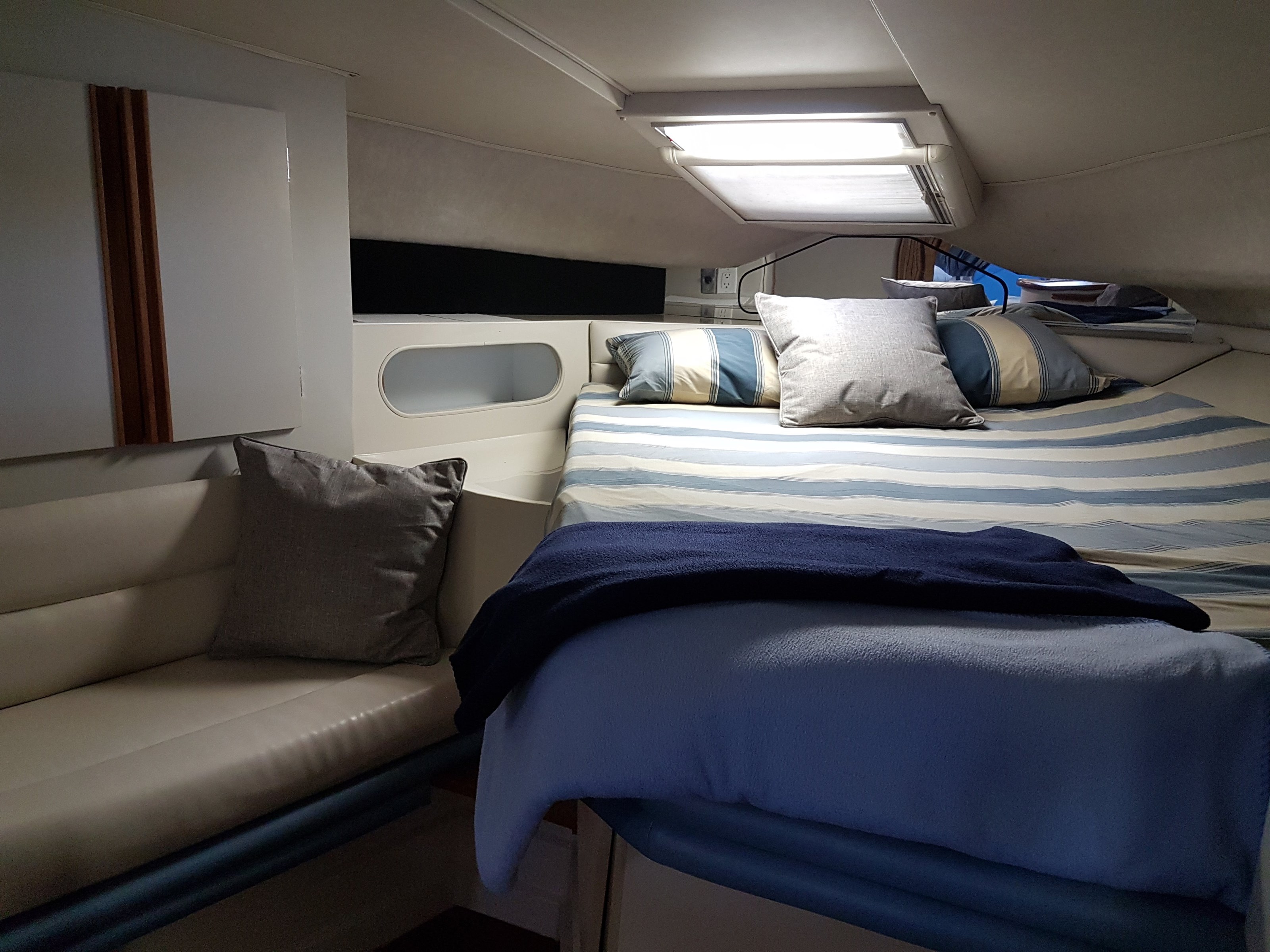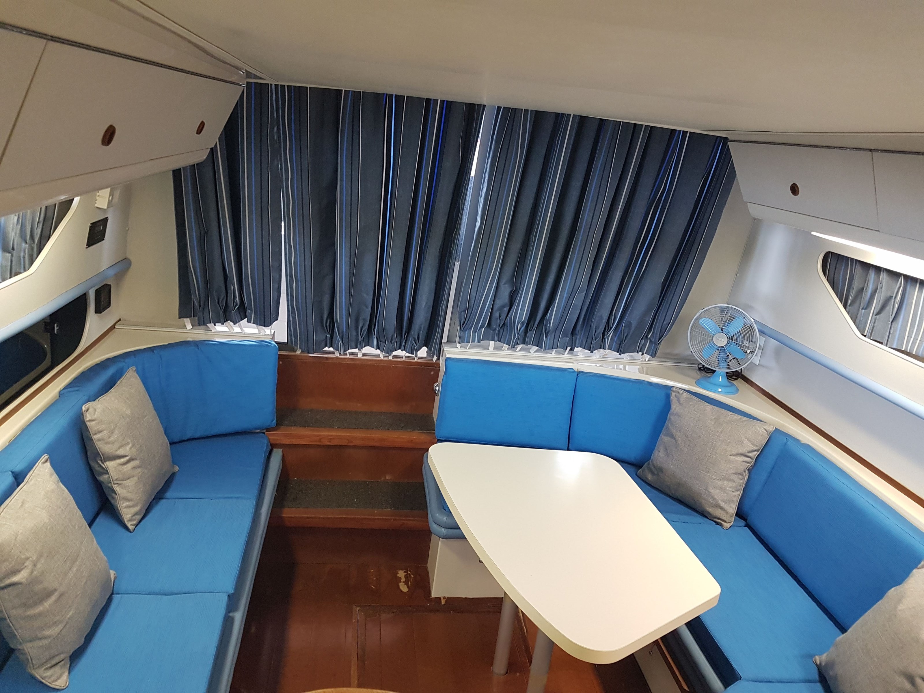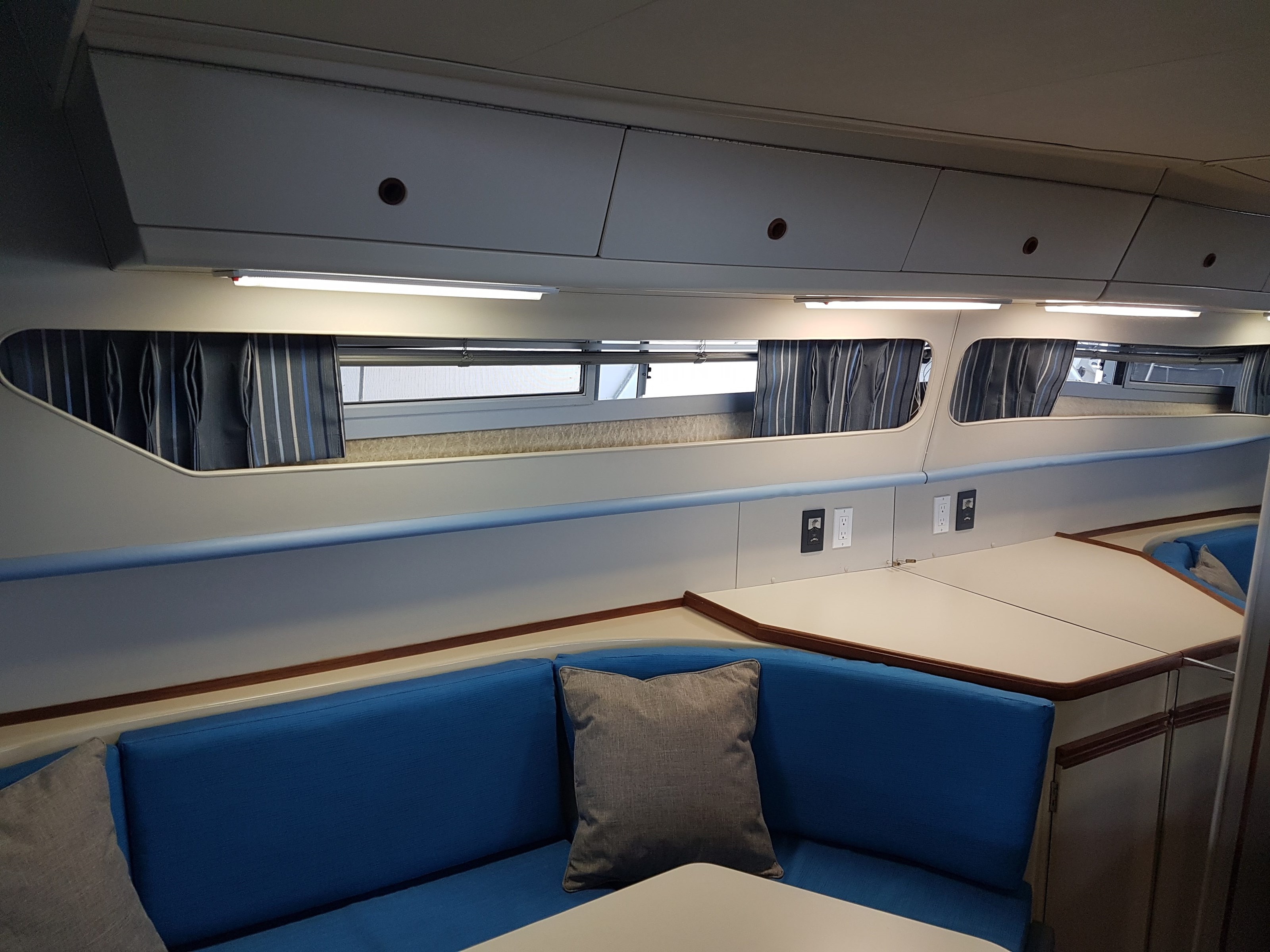 All new interior seating, a new mattress, interior curtains, and a sun pad were installed in 2020. Covers were made for the exterior chairs and benches in 2021. A new bimini top and modern exterior shade curtains were made at the end of the 2022 boating season. All fabrics are Sunbrella. The bimini top and shade curtains were installed in June 2023 and the boat has remained docked in a covered shed since that time.
