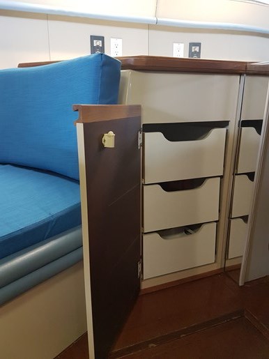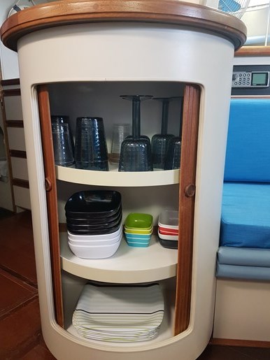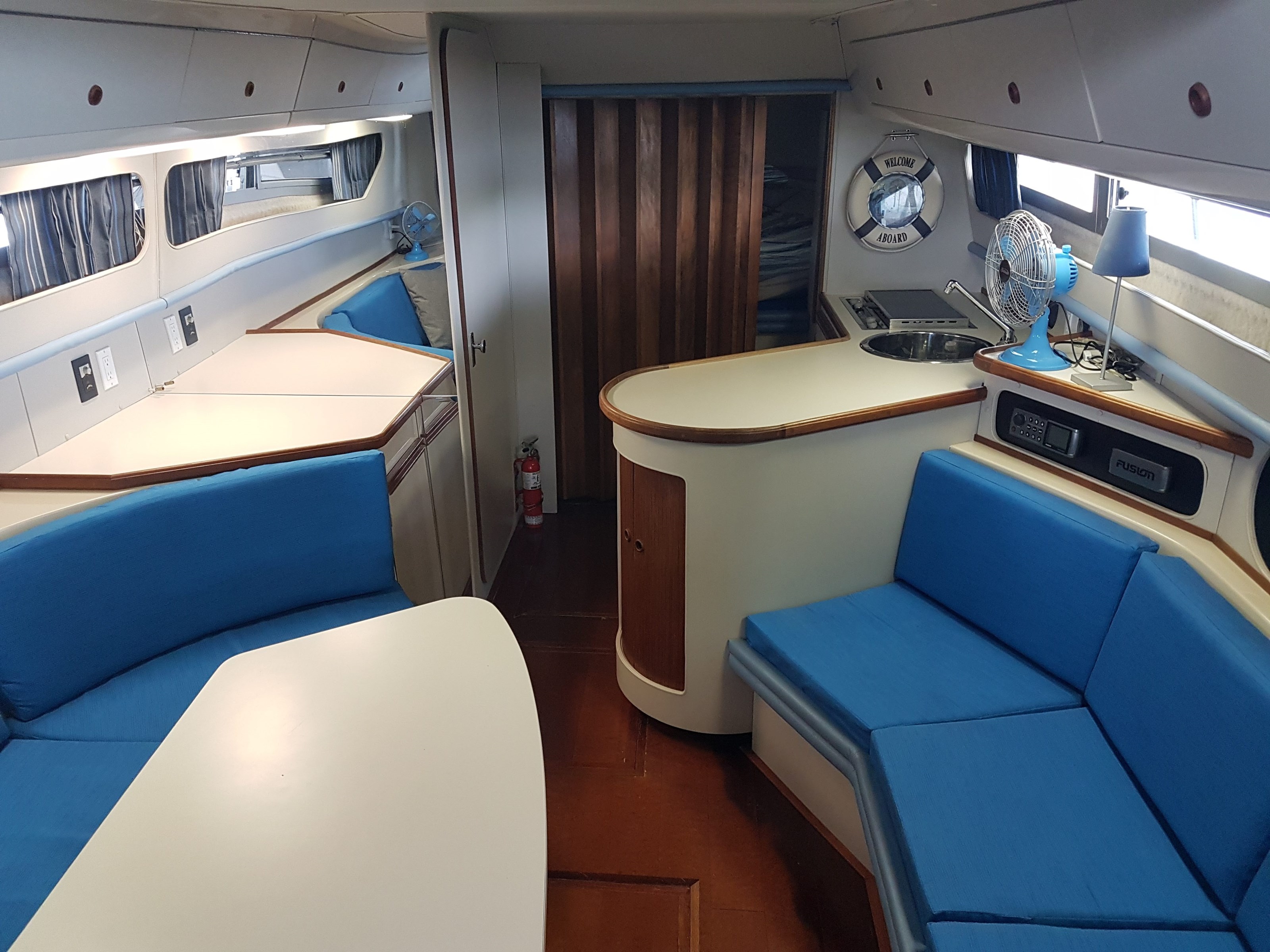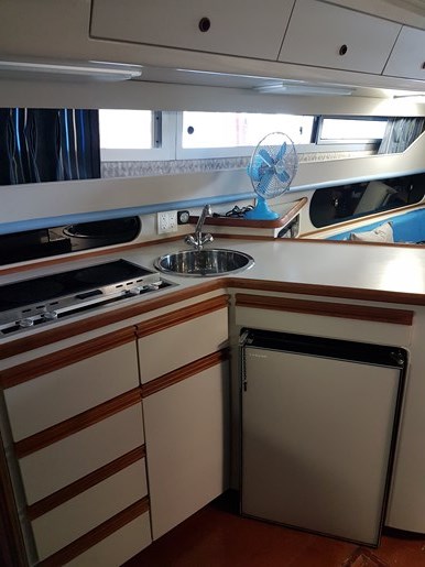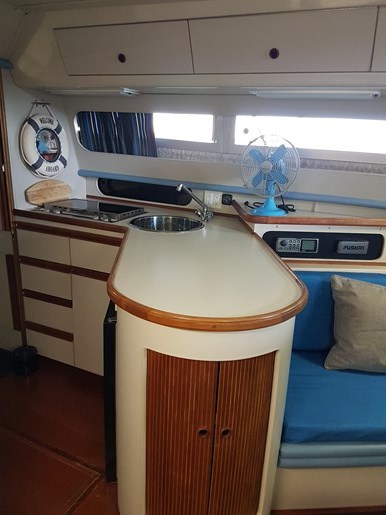 The boat is offered with a number of onboard accessories including dishes, cutlery, utensils, pots and pans, toaster oven, fans, a portable heater, and extra lines.