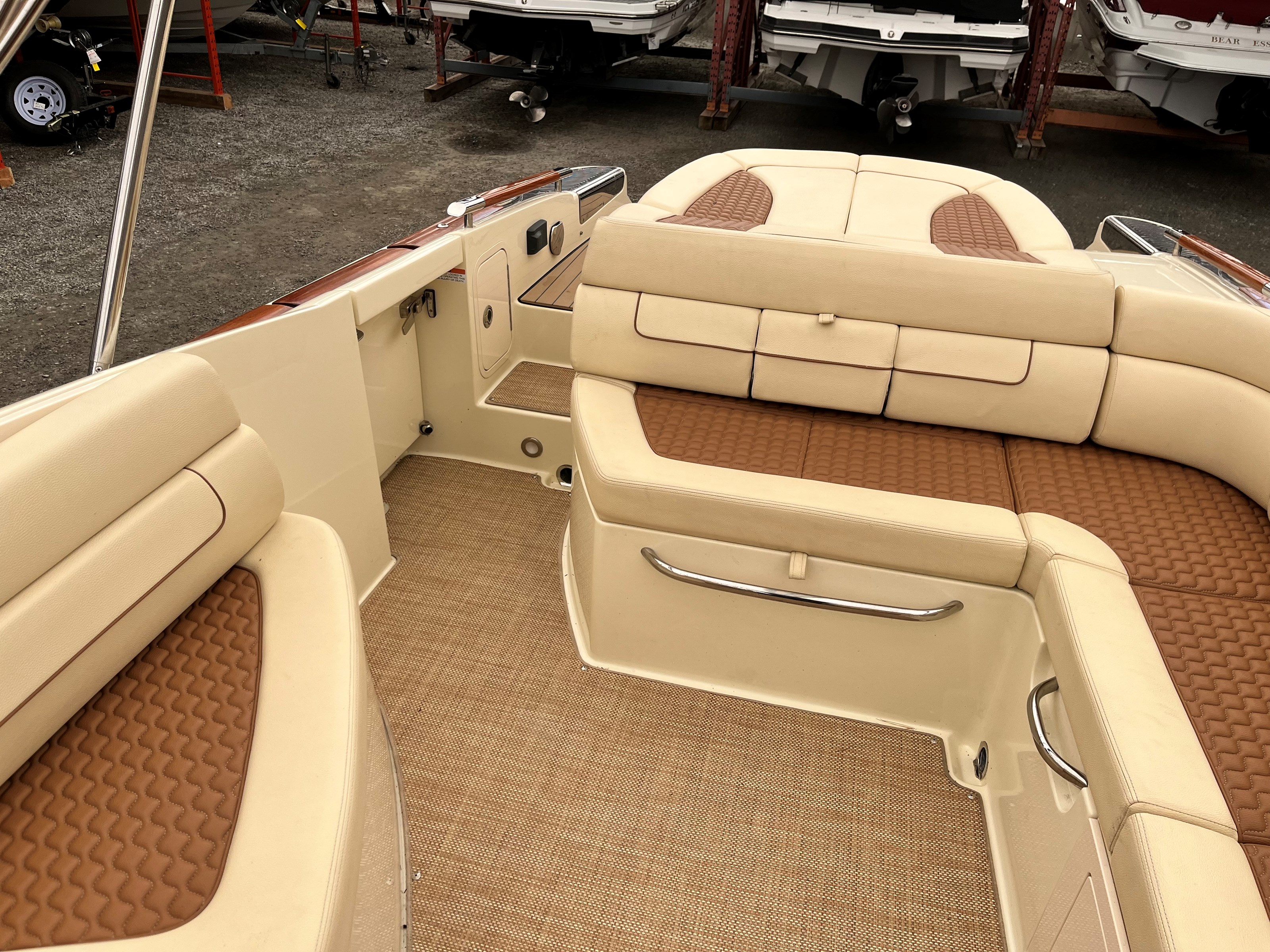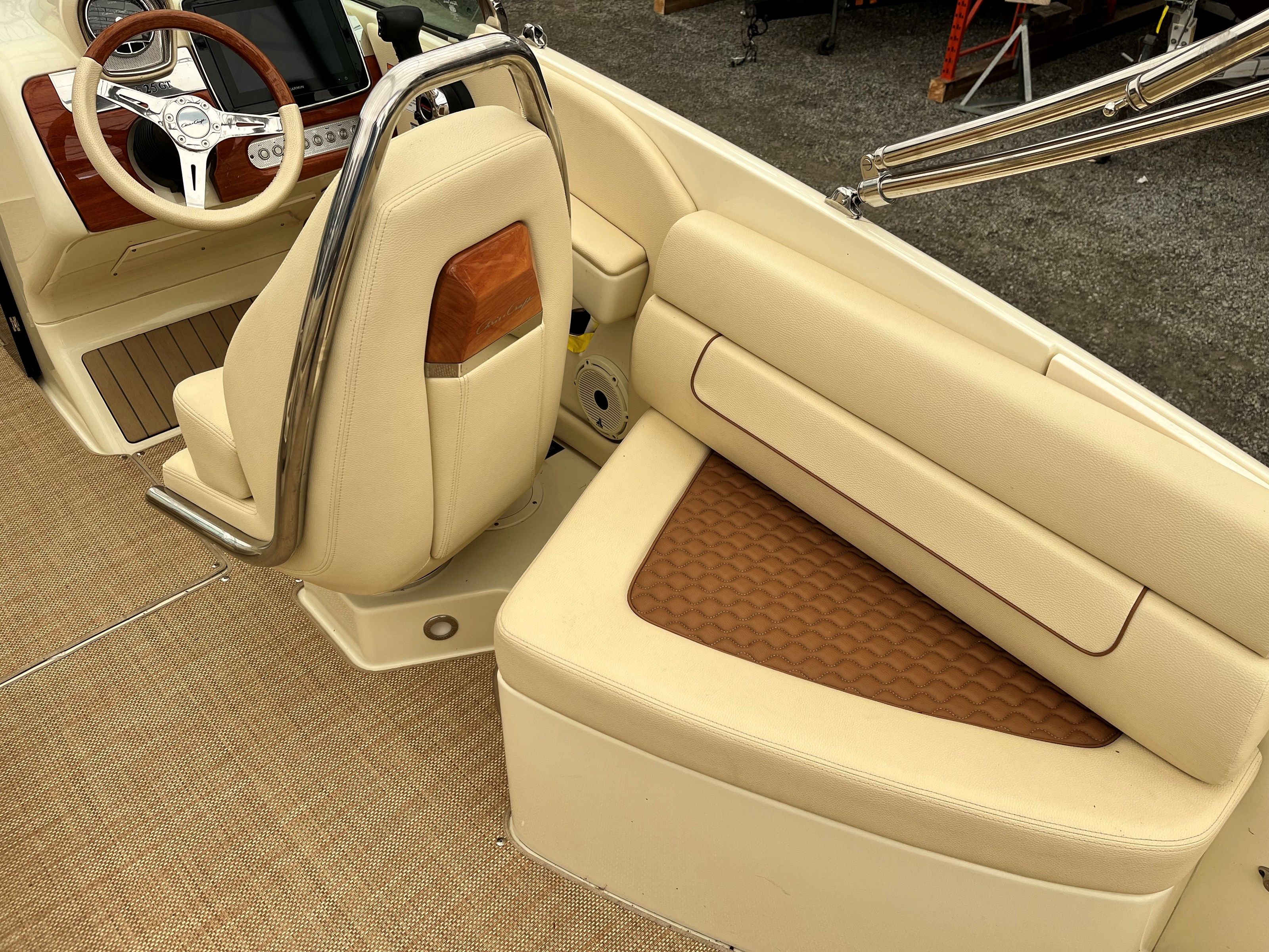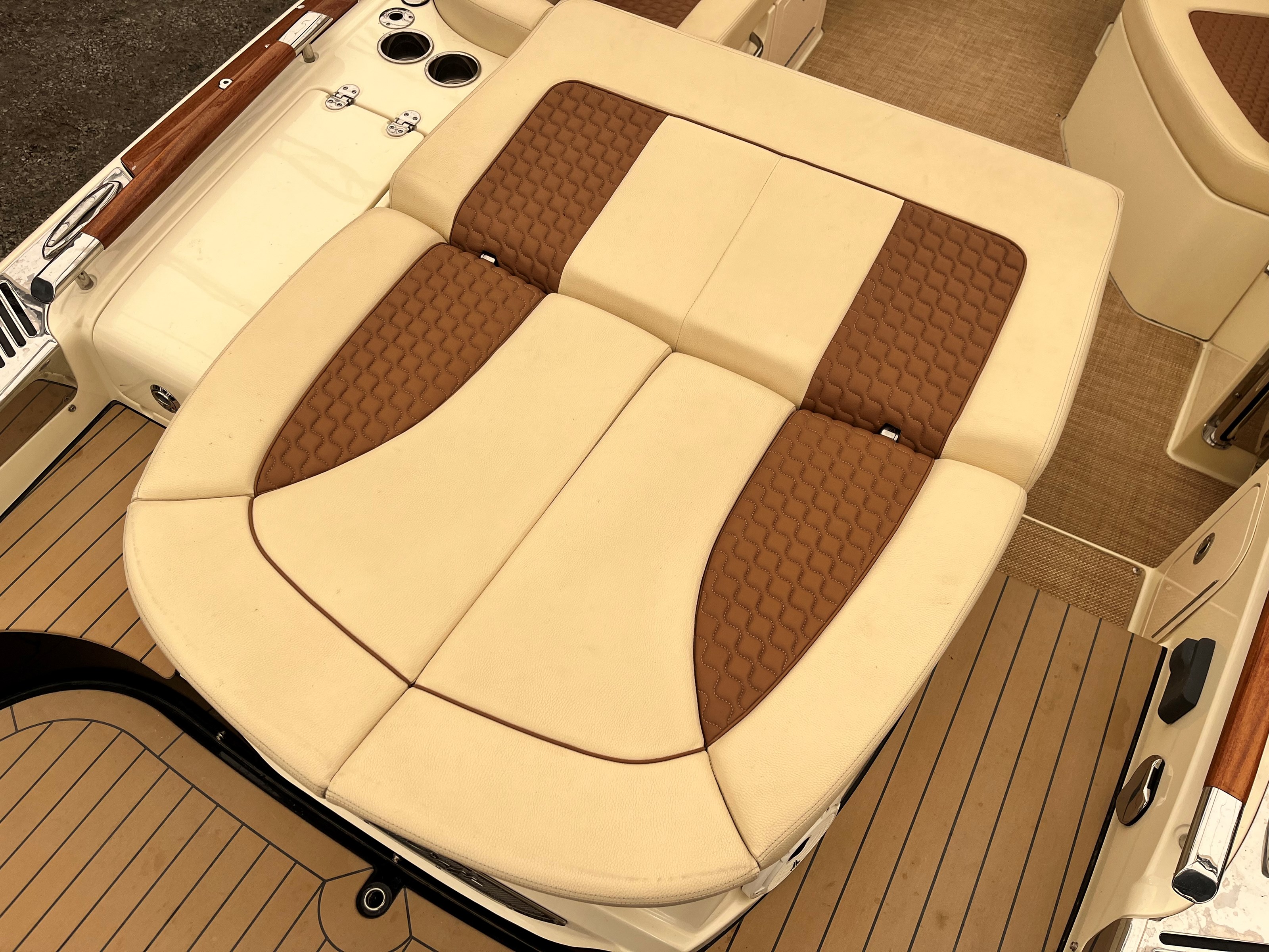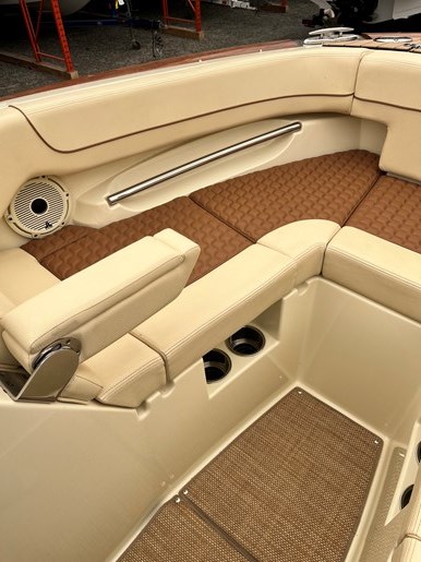 - The wraparound bow includes dual forward-facing seating, each with a fold-down armrest and cupholders within easy reach.