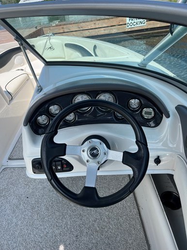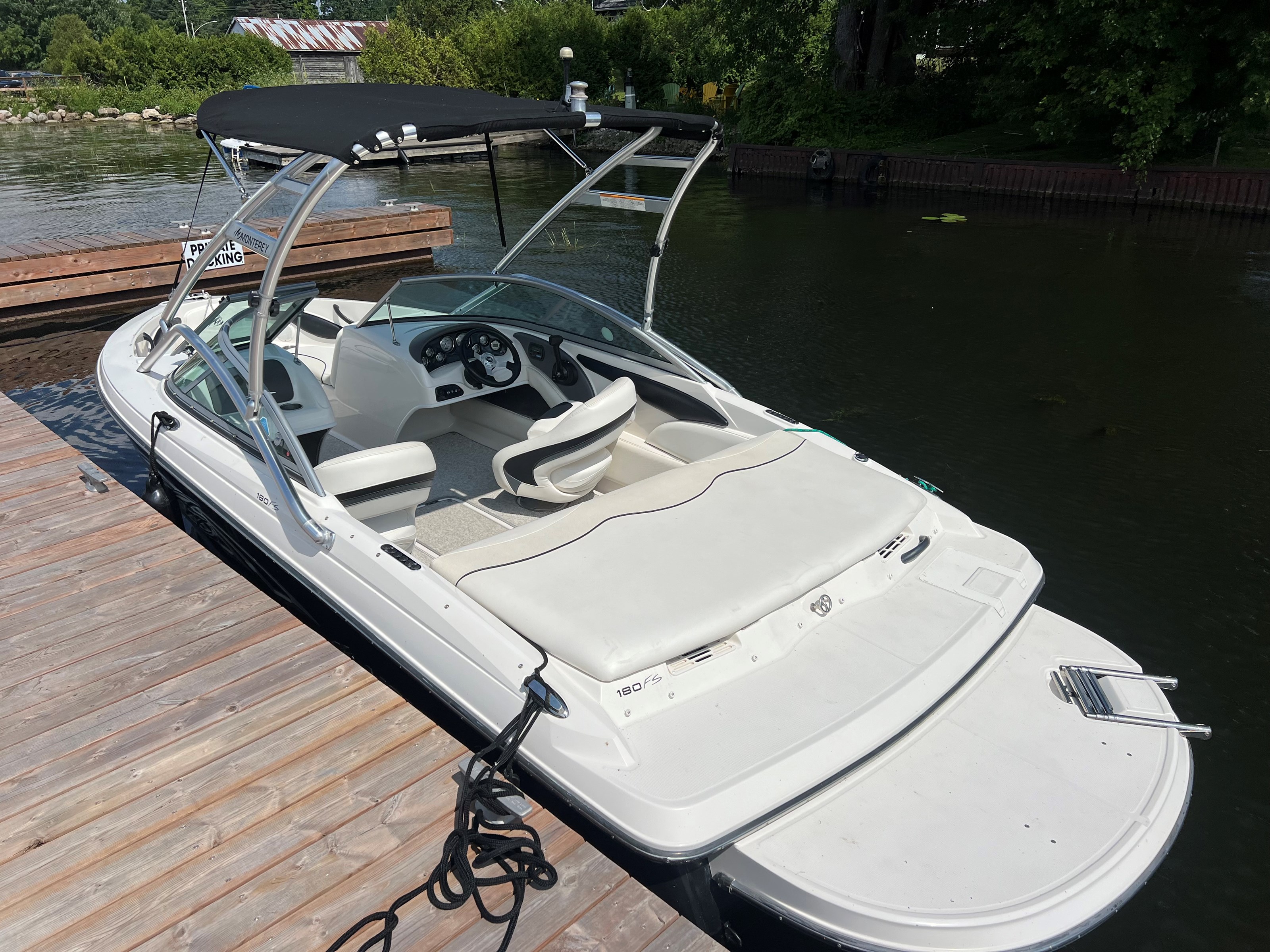 The Monterey 180 FS is known for its sporty design and versatility. It's constructed with a fiberglass hull and features a spacious layout with comfortable seating and a sunbathing platform.
