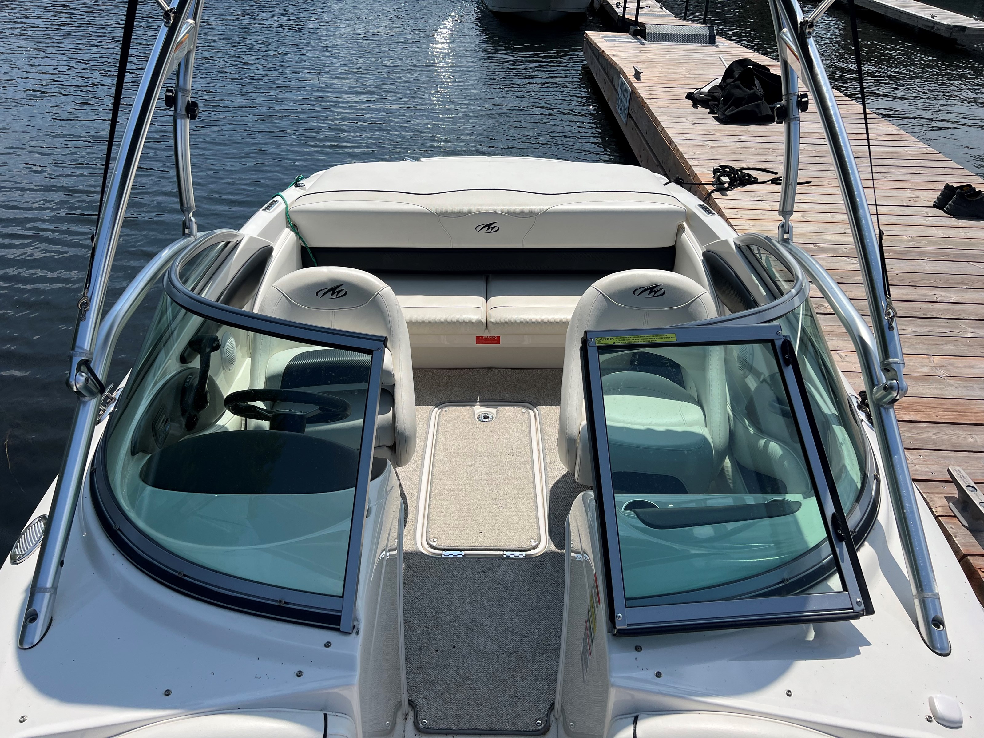 Equipped with a MerCruiser 4.3L engine, it's suitable for various water activities like wakeboarding, skiing, and cruising.