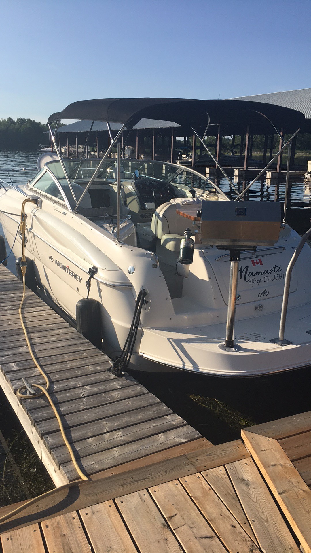 • Amenities: Enclosed head with shower/holding tank, galley (microwave, fridge), wet bar, swim platform, and hot/cold transom shower.