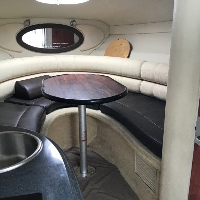 • The Monterey 250CR is a cuddy cabin cruiser designed for socializing and overnighting.  The dry weight is 5200 lbs, with an 80 gallon fuel tank and sleeping for 4.